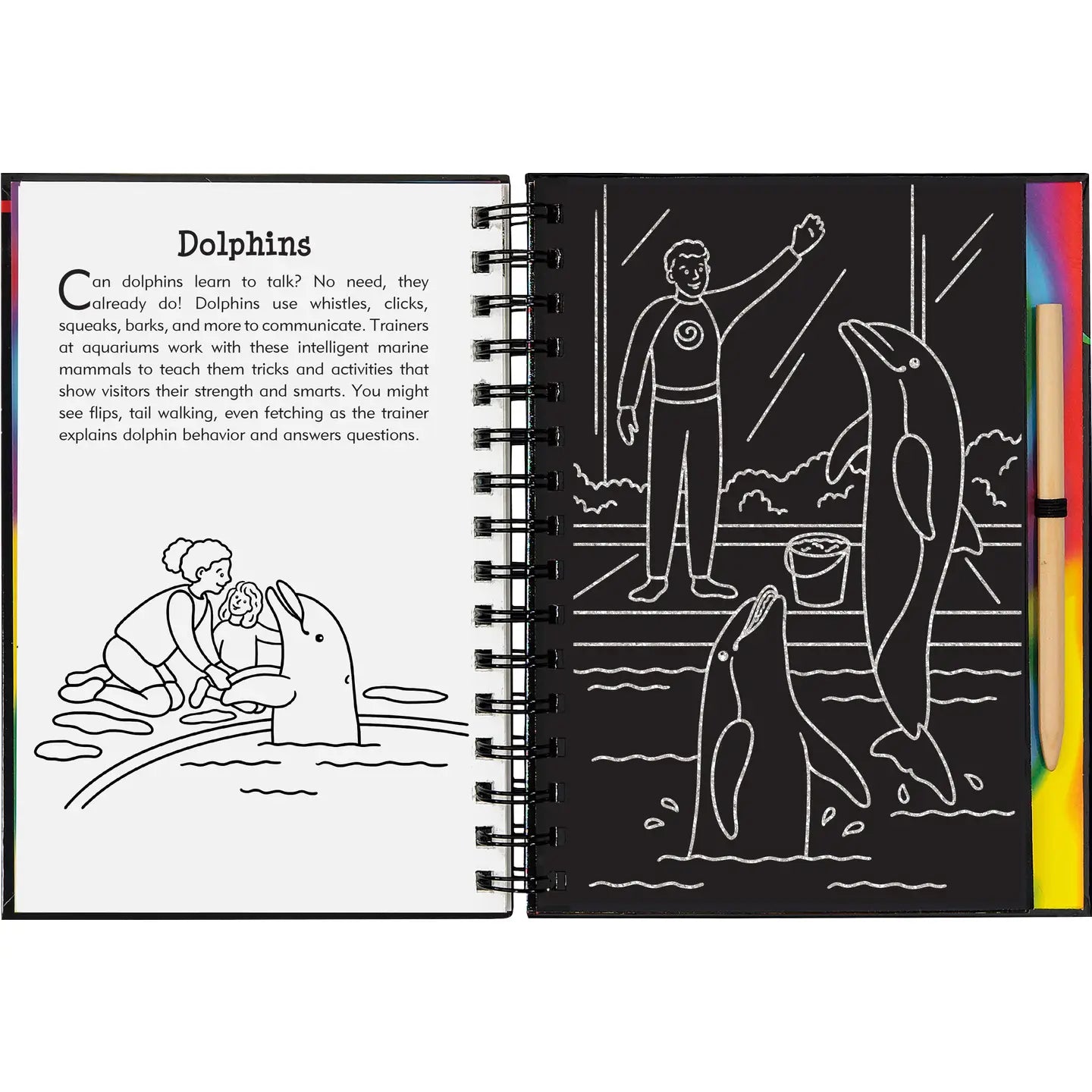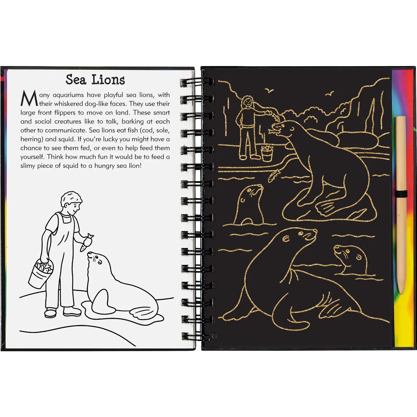 Welcome to the aquarium! Dive in and discover its amazing sea creatures, from dolphins to whales, and bring them to life in brilliant color! Simply trace the white outlines on the black-coated pages to reveal the vibrant colors beneath! Makes a fun way for young children to build confidence in their creativity. They can also draw their own pictures on extra sketch pages in the back. Art activity book contains 20 black-coated scratch-off pages, 20 illustrated pages with informative text, and 20 pages for independent drawing. Wooden stylus comes shrink-wrapped with the book. Ages 5 and up. Sturdy wire-o binding. Book measures 6-3/8'' wide x 8-1/2'' high. 64 pages. Non-toxic. Potential eye irritant. Avoid inhaling particles of scratch coating. Not for children under 5 years. Meets all applicable safety standards.