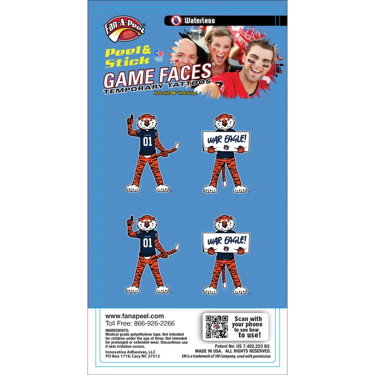 Get your game faces on! Show your game day style with game faces® temporary tattoos. Each package contains 4 waterless temporary tattoos. Tattoos are approximately 1.25" x 1.25" and are printed on clear, 3m® brand, hypoallergenic, medical tape.
