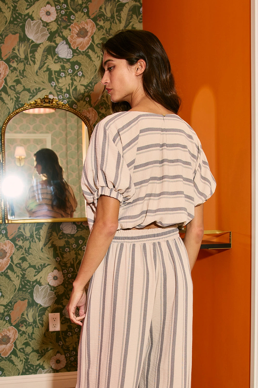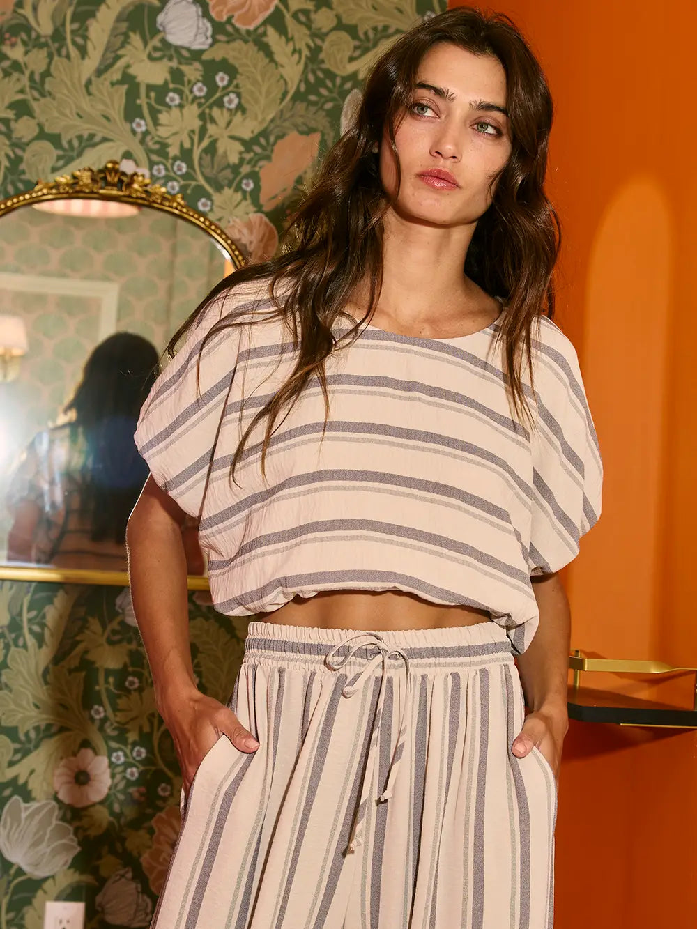 Bubble Hem And Sleeve Striped Crop Top - Boat neckline - Short bubble hem sleeves - Cropped silhouette