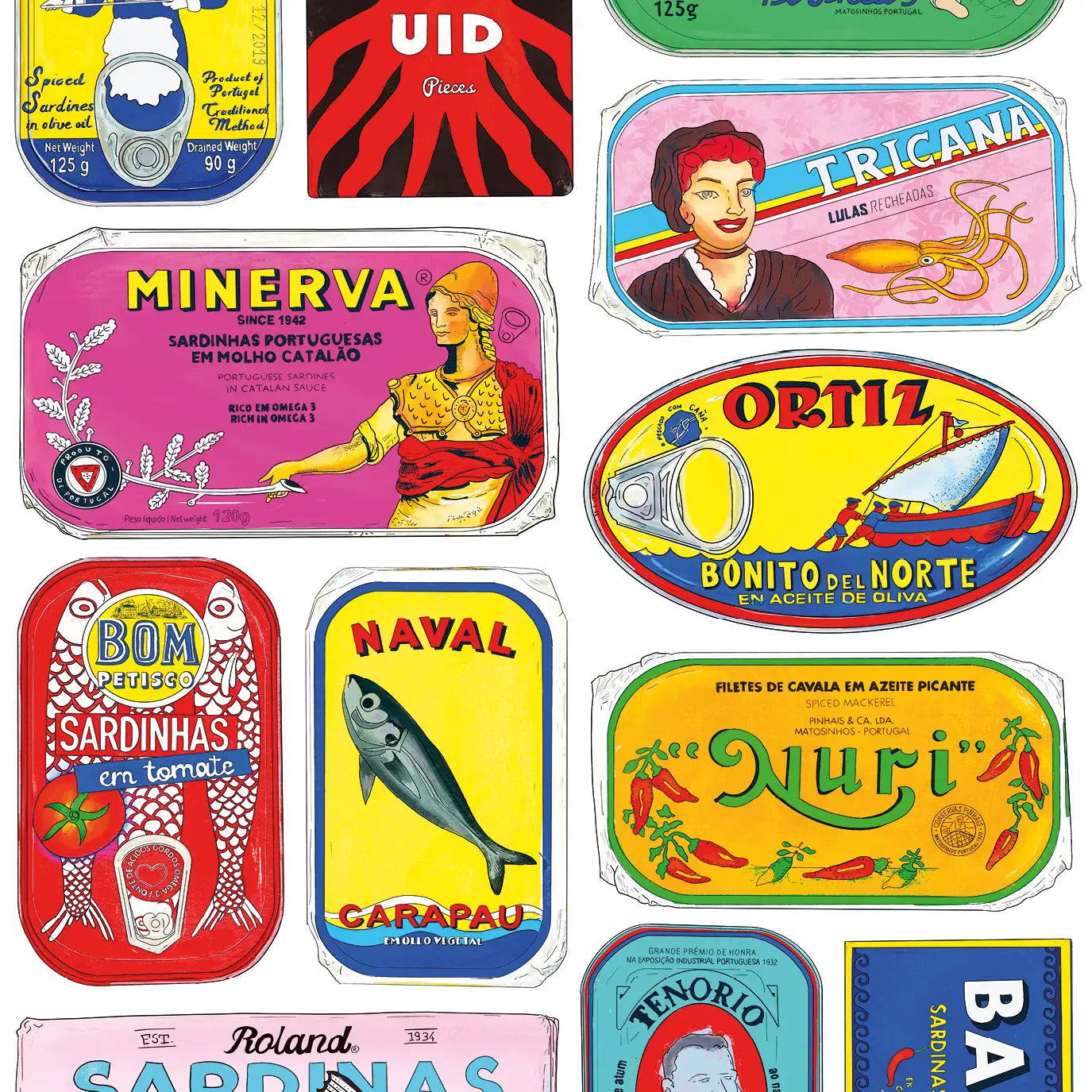 1,000 piece puzzle featuring illustrated tinned seafood by Natalia Yañez-Stiel - Made in the Netherlands, printed with vegetable-based ink using sustainably sourced high quality FSC paper and 100% recycled board.
