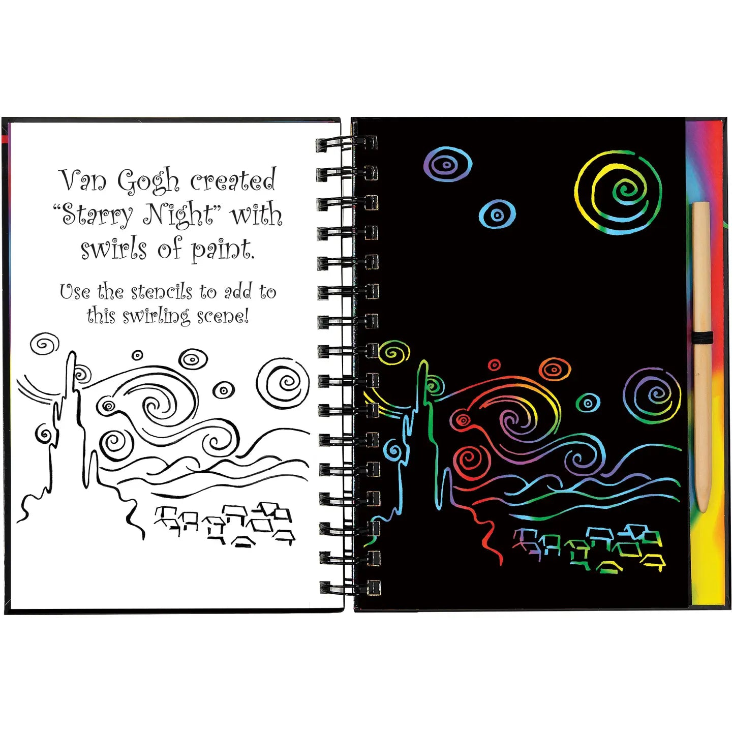 Use the wooden stylus included to scratch off the black coating on each page of this super-cool art activity book, and see colorful swirls or glittery foil appears like magic! 20 drawing and design projects provide hours of creative fun. Super Scratch and Sketch also comes with 2 sheets of stencils to use in your designs. Book includes 20 black-coated scratch-off pages, 20 illustrated pages with text and activity suggestions, and 20 extra pages for independent drawing and sketching. This is a Trace-Along Scratch and Sketch ! White outlines on black scratch-off pages create a fun way for younger children (5 and up) to build confidence in their creativity as they reveal brilliant patterns, swirls, and colors beneath! Wooden stylus is shrink-wrapped with the book. Sturdy wire-o hardcover binding. Art activity book measures 6-3/8'' wide x 8-1/2'' high