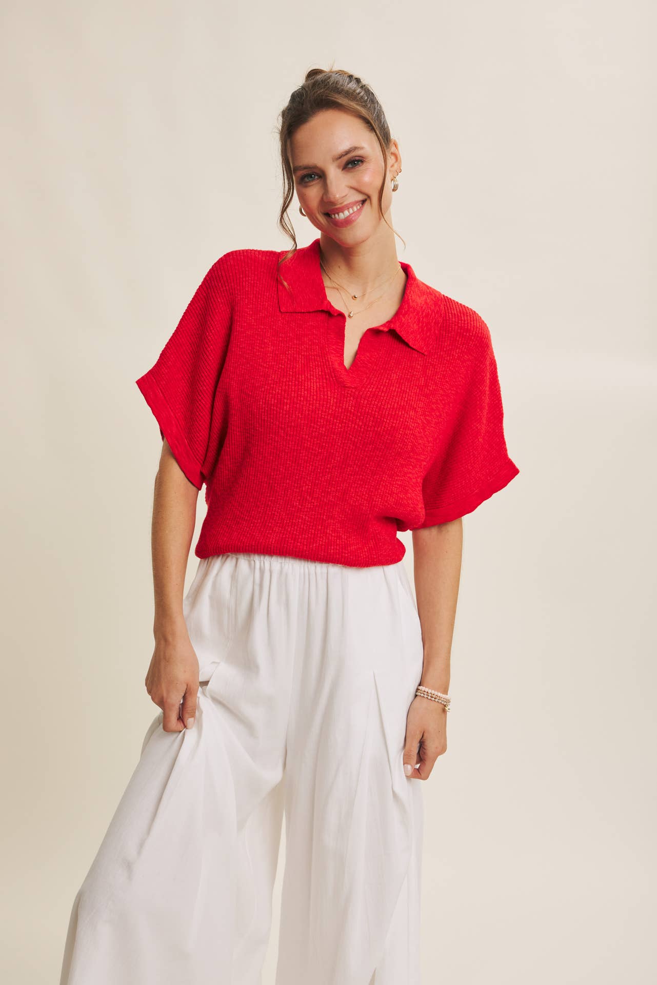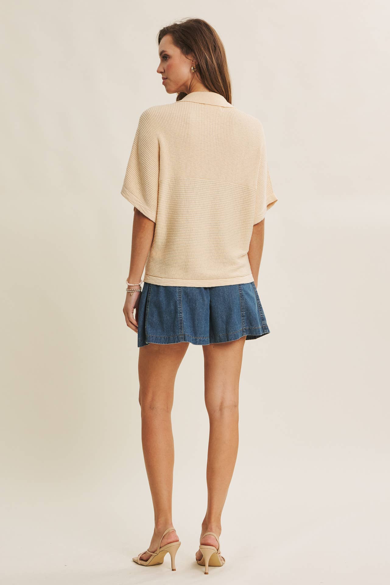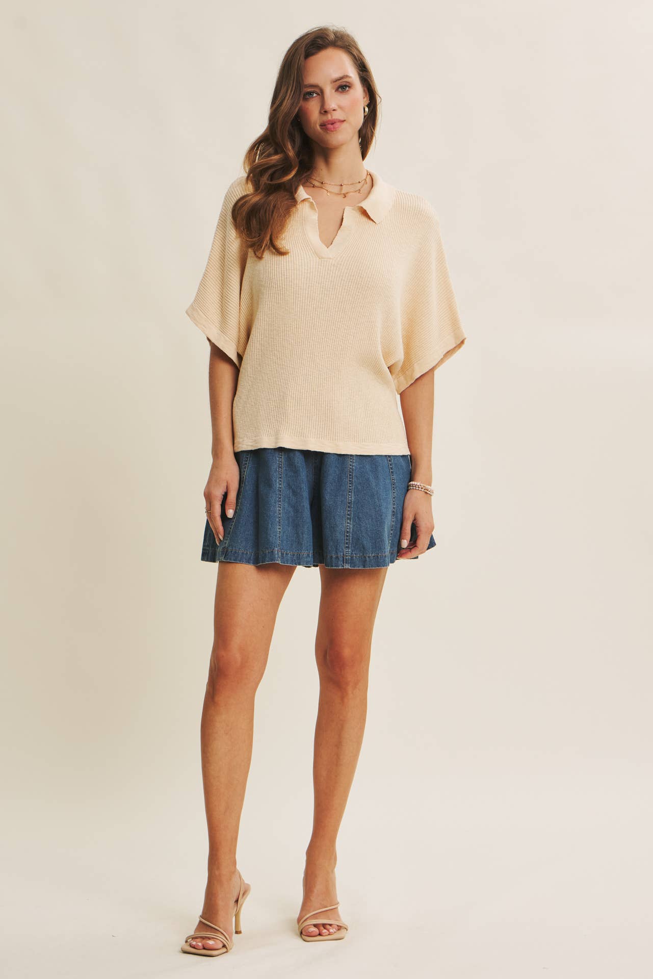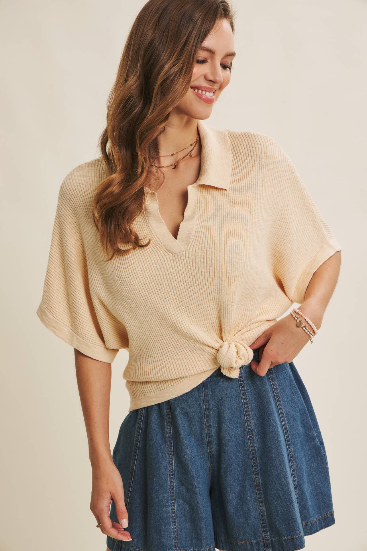 Timeless and effortless, this collared slub rib knit sweater is an instant favorite for the FW season. Featuring a split neckline, dolman short sleeves, and a boxy fit, it balances structure with ease for a polished yet relaxed look. The soft cotton-viscose blend brings breathable comfort, making it a perfect transitional knit that carries from late summer into crisp autumn days. Whether styled with tailored trousers for work, layered over romantic skirts for a soft seasonal look, or paired with denim for casual weekends, this versatile sweater offers endless outfit possibilities. With its bestselling silhouette reimagined in a new version, it’s a proven piece that keeps customers returning Features - Split neck - Collared - Slub rib sweater knit - Short dolman sleeves - Cotton viscose blend Size + Fit Model is 5'9.5" and wearing a size Small Please refer to our size chart.