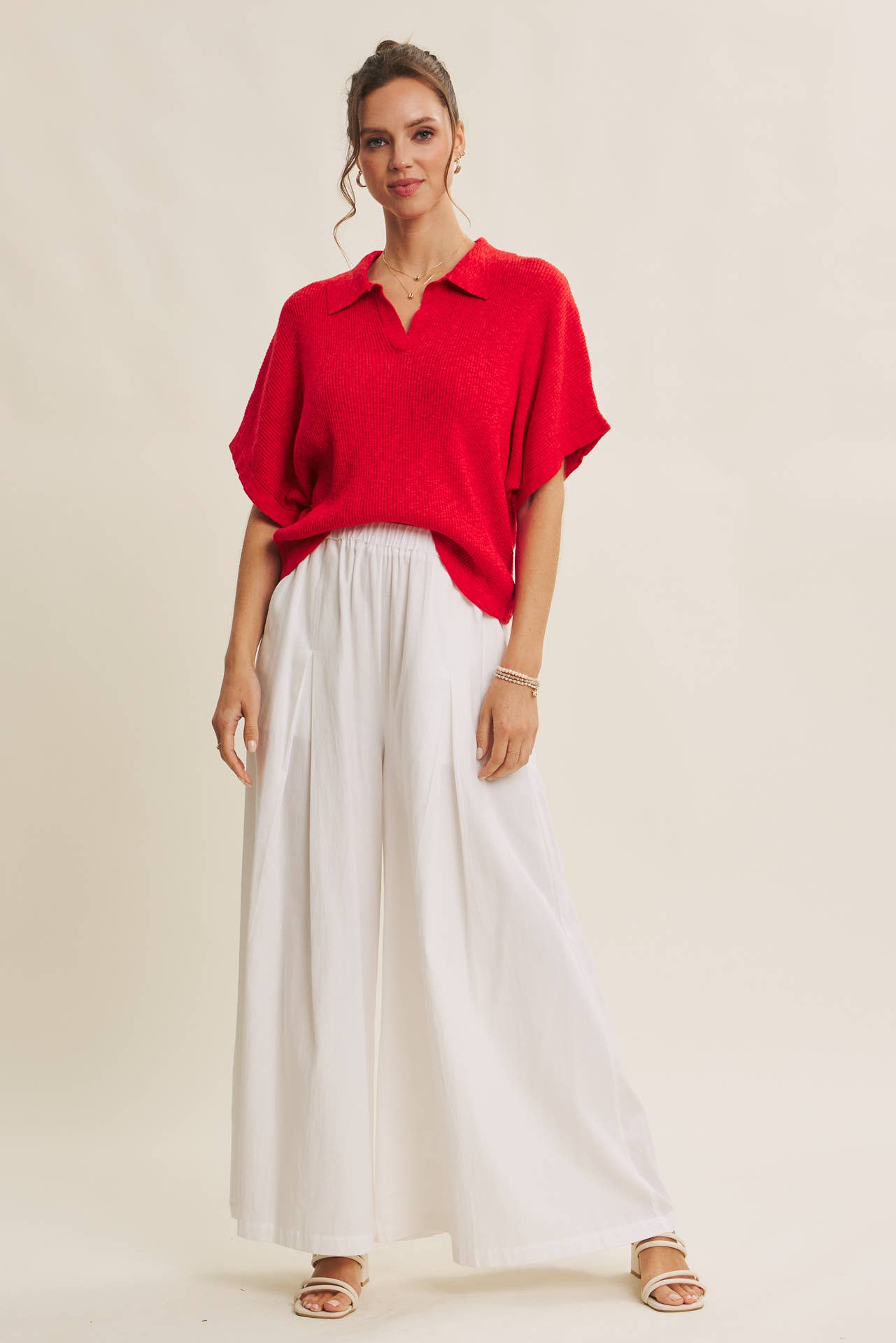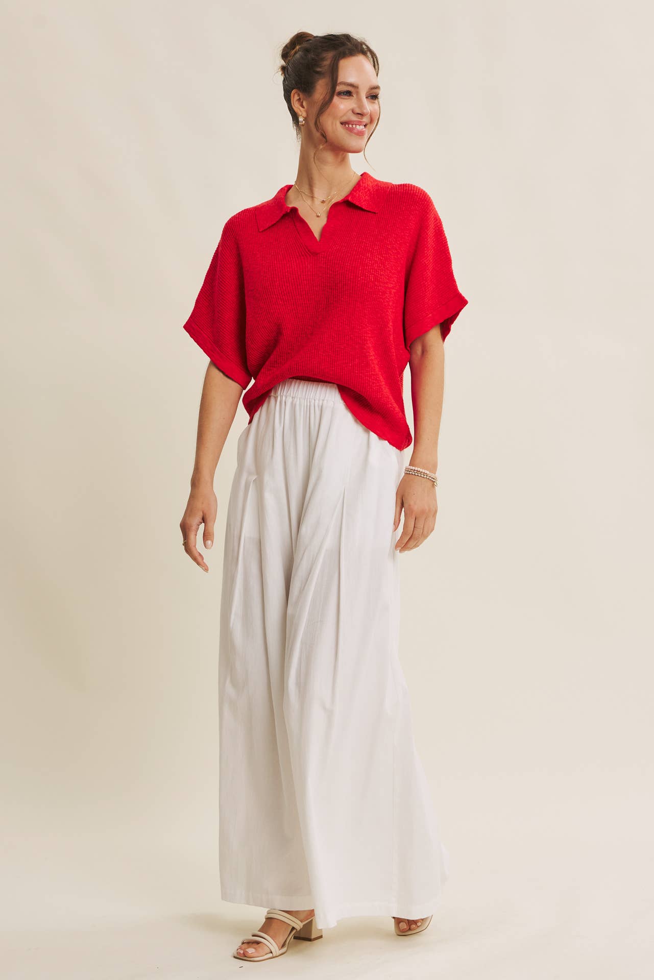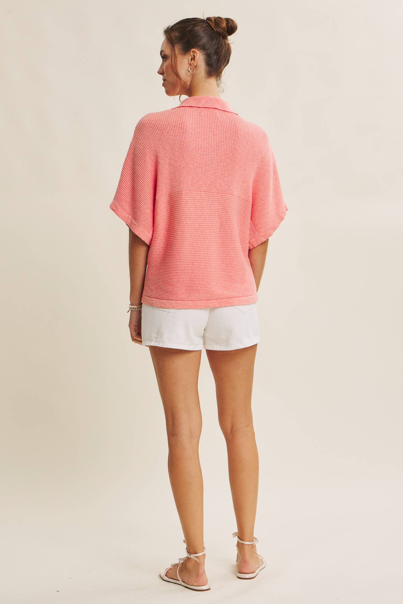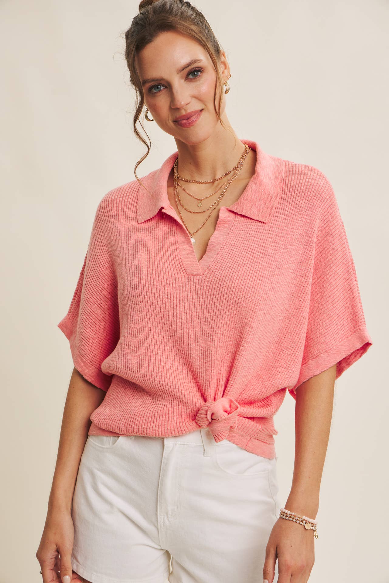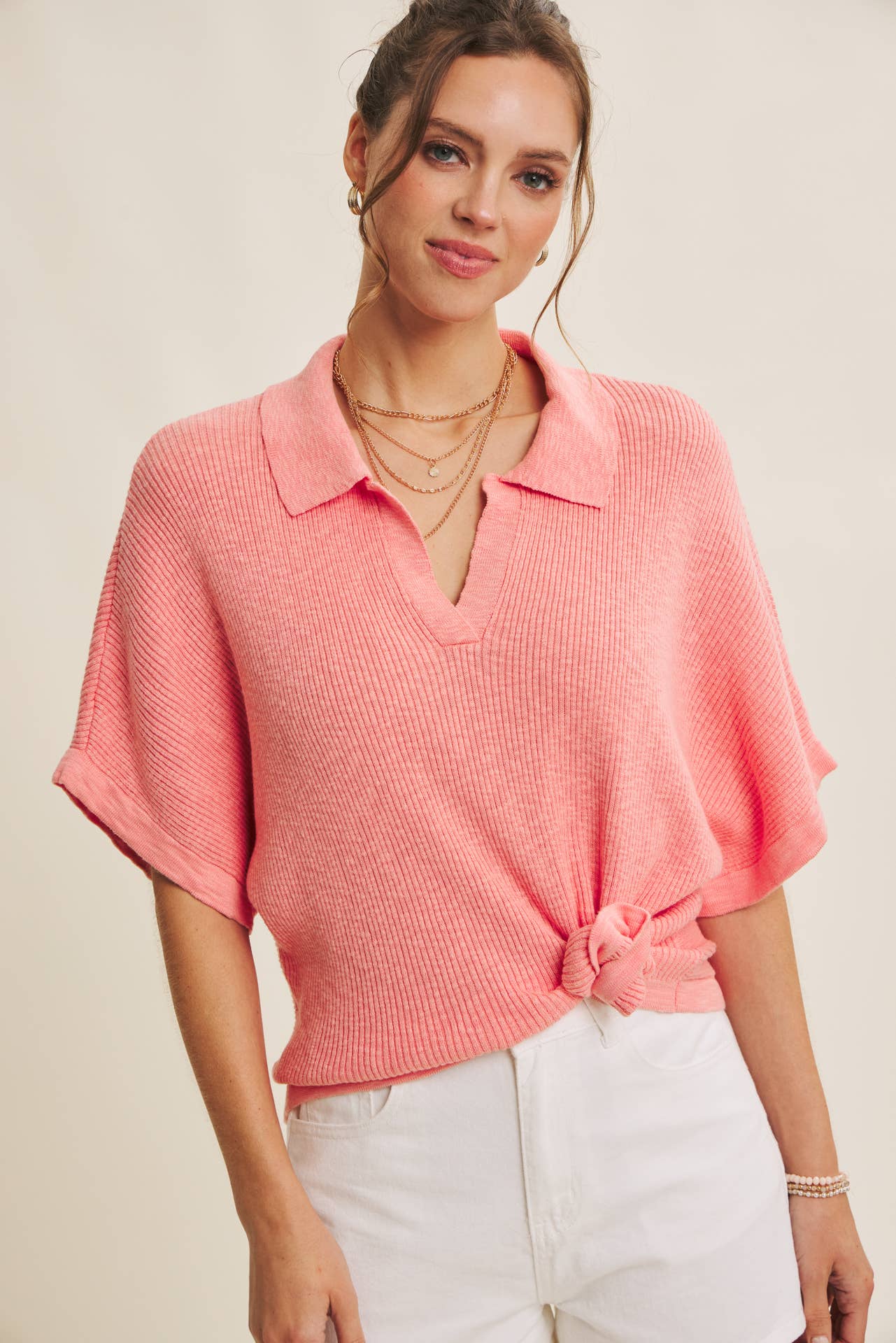 Timeless and effortless, this collared slub rib knit sweater is an instant favorite for the FW season. Featuring a split neckline, dolman short sleeves, and a boxy fit, it balances structure with ease for a polished yet relaxed look. The soft cotton-viscose blend brings breathable comfort, making it a perfect transitional knit that carries from late summer into crisp autumn days. Whether styled with tailored trousers for work, layered over romantic skirts for a soft seasonal look, or paired with denim for casual weekends, this versatile sweater offers endless outfit possibilities. With its bestselling silhouette reimagined in a new version, it’s a proven piece that keeps customers returning Features - Split neck - Collared - Slub rib sweater knit - Short dolman sleeves - Cotton viscose blend Size + Fit Model is 5'9.5" and wearing a size Small Please refer to our size chart.